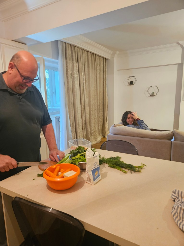 We then headed back to our Airbnb. Our apartment wasn’t the best, but it was fine for hanging out and cooking, parking was fairly easy, and we could walk to most places, including Marina’s school and the old central part of town. Russell made Marina very happy by making a great pasta with red sauce and a giant pot of chicken soup! We even found alphabet noodles, which have disappeared from supermarkets in Central New York. The alphabets did not have diacritical marks.